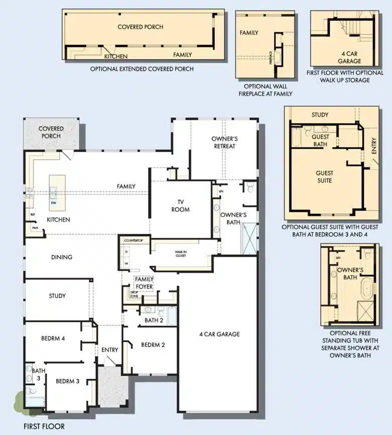 A guest room and Jack-and-Jill bedrooms provide plenty of privacy and a place for out-of-town guests. The covered porch, open study, TV room and 4-car garage help this home adhere to your unique lifestyle.