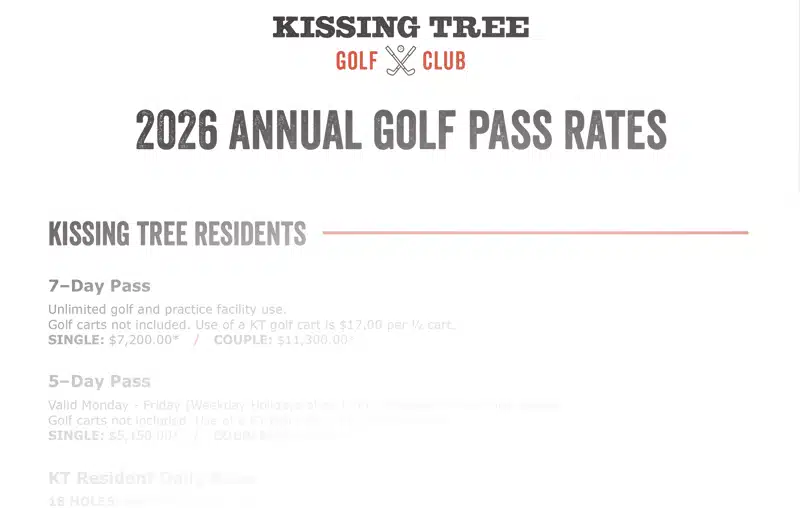 Yup, it’s true — when you’re a Kissing Tree resident, one of the best perks is better rates on golf at the Kissing Tree Golf Club. Download our golf rate sheet to get more information on the pricing for resident golf packages.