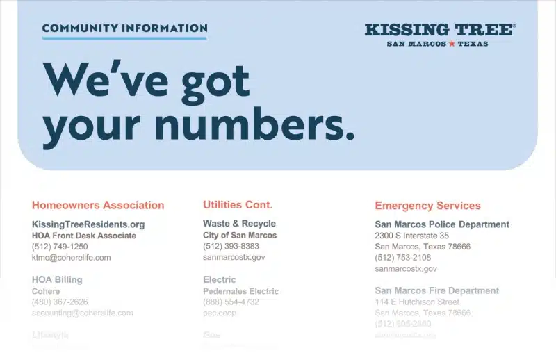 With so much going on in and around Kissing Tree, there’s a lot to share! We wanted to put all of our most requested information and documents in one place so they would be easy to find. Should you need more information, feel free to call us anytime at 512-379-5856.